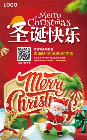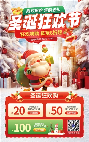 红色喜庆 圣诞老人+圣诞树+礼盒背景 优惠券 圣诞狂欢节 扫码立减宣传大海报