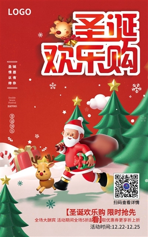 红色喜庆 圣诞老人 驯鹿 下雪天 圣诞树 圣诞欢乐购 圣诞节购物宣传大海报
