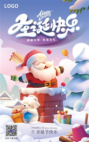 蓝绿小清新 C4D 圣诞老人 可爱小熊 烟囱 下雪 雪地 松树林 圣诞快乐宣传大海报